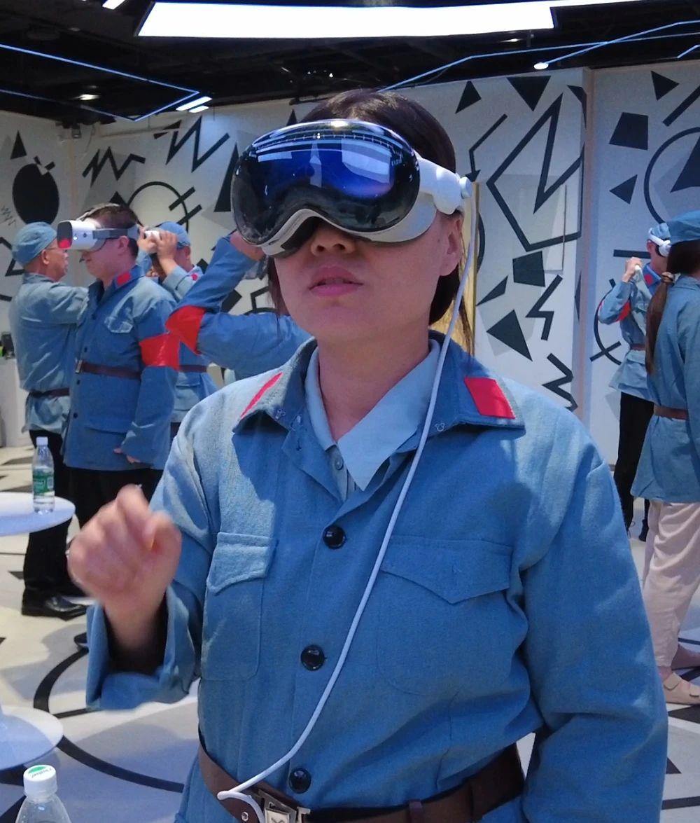 在“紅游智覽”環節,黨員們佩戴VR紅色黨建一體機等頭顯設備,進入數智技術構建的沉浸式紅色空間。全景環繞的視聽效果,讓人仿佛置身歷史現場,步入那一幕幕定格于史冊的瞬間。隨著場景轉換,大家在虛擬與現實交織的氛圍中真切感受到信仰的厚度,并在互動協作中凝聚起奮進的力量。